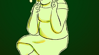 [Image- Drawing of the character Elby, sitting and listening to music from a big pair of headphones. She's sitting in a simple dark green space, whereas she is colored in light green, with the headpho...